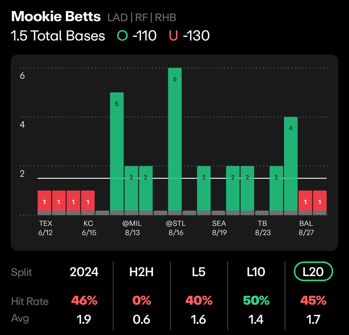 On the season, Betts is batting .324 vs LHPs. While he hasn’t found as much power against them to this point this year, we know in seasons past that Betts has faired well vs lefties. With the average still there, he could look to get back over the 1.5 line with Povich on the mound. Povich has a .299 pBA when facing RHBs this season, with 11 more XBHs allowed to righties than lefties.