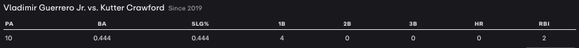 Vlad is batting .321 when facing a righty this season and has 4 singles in 10 PA vs Crawford previously. While Crawford has a .216 pBA this season, he has been giving up barrels, allowing 28 home runs. With Vlad racking up XBHs recently, this could be a good match-up for some solid contact on his end.