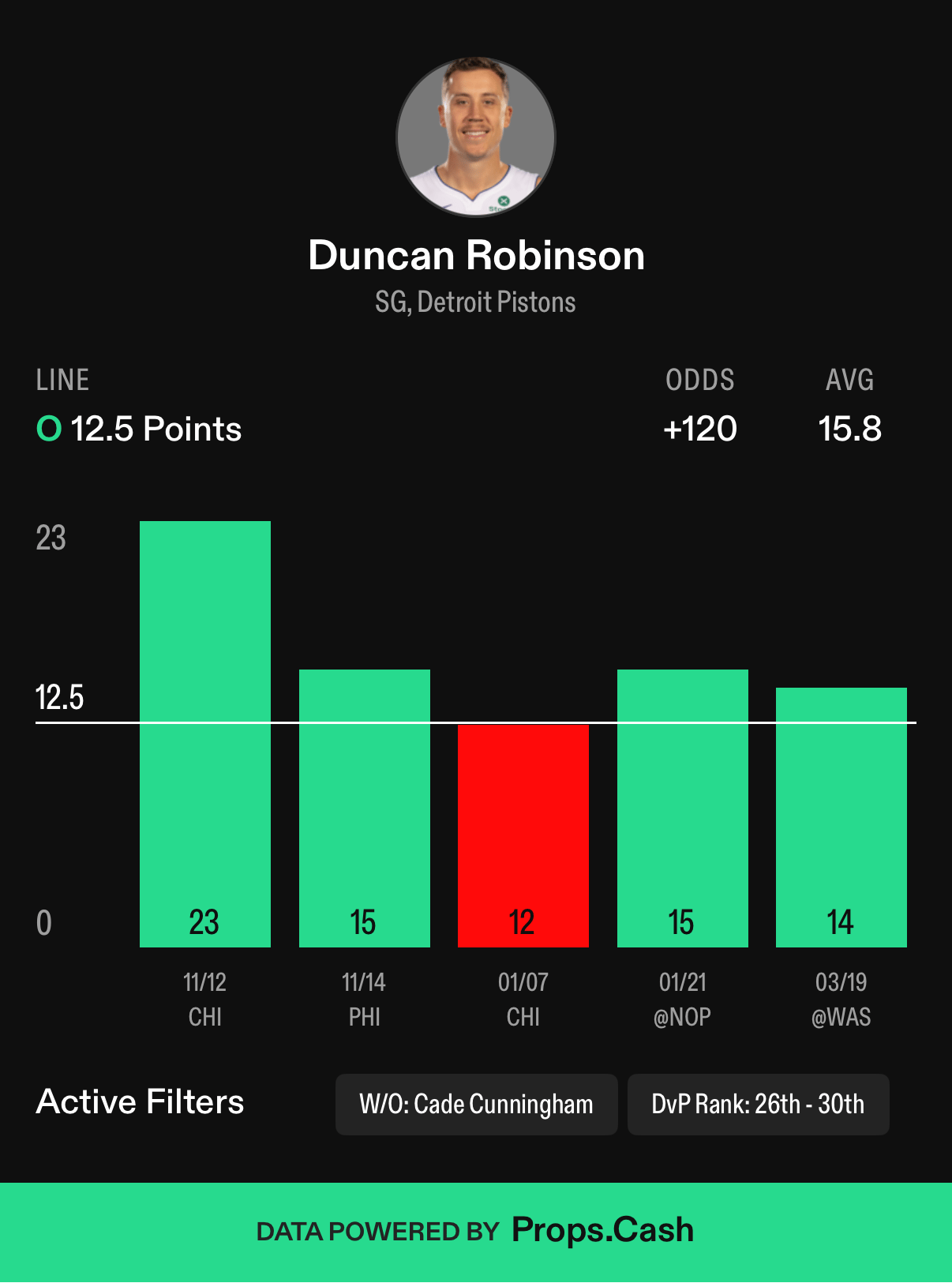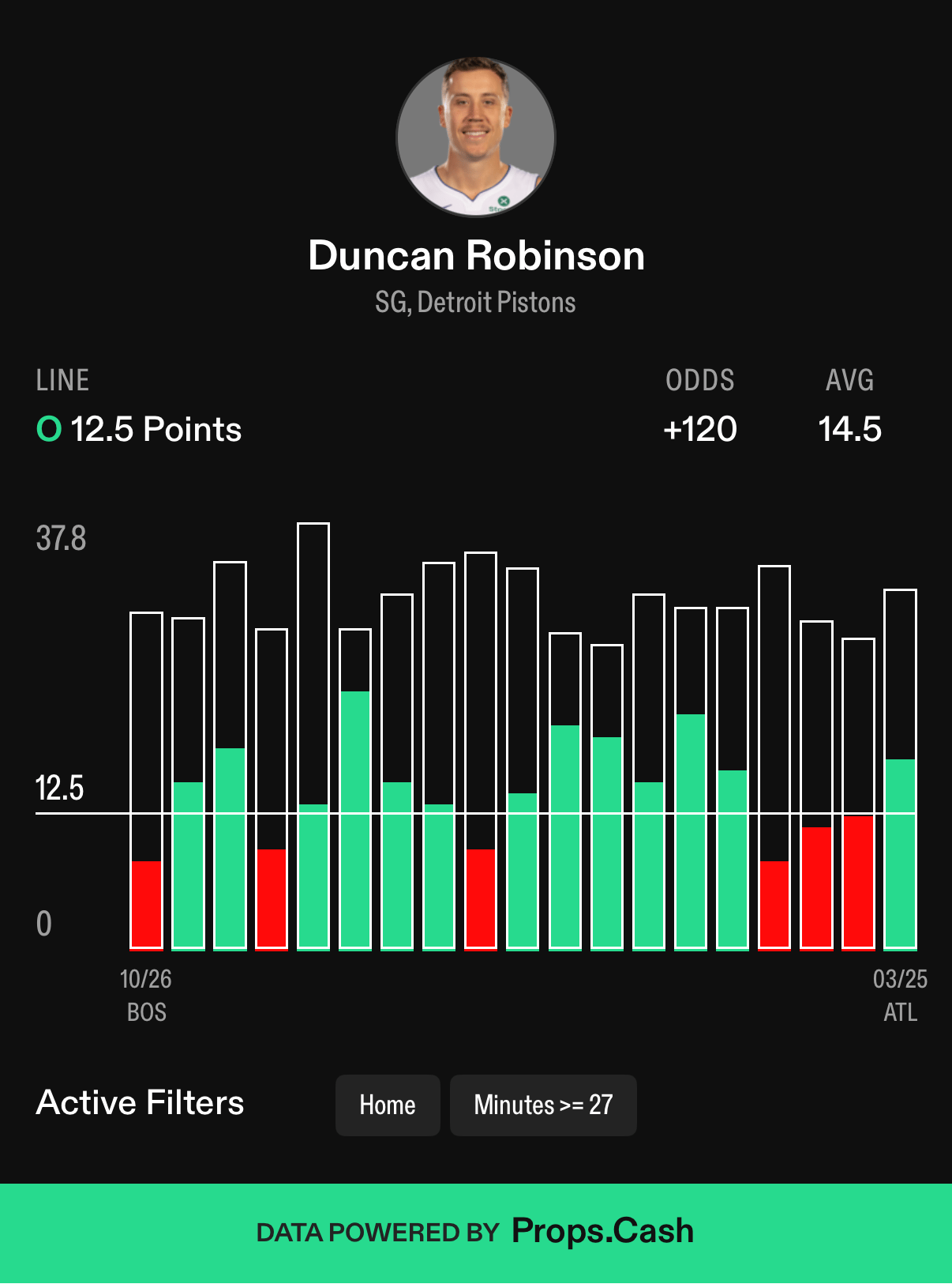 The Pistons have played 5 games since Cade went down with his lung injury, and in 4 straight games, Robinson has played 27 or more minutes. This season, when playing 27 or more minutes, he’s averaging 13.2 points per game with a 58% hit rate, and 14.5 points per game at home with a 68% hit rate.
