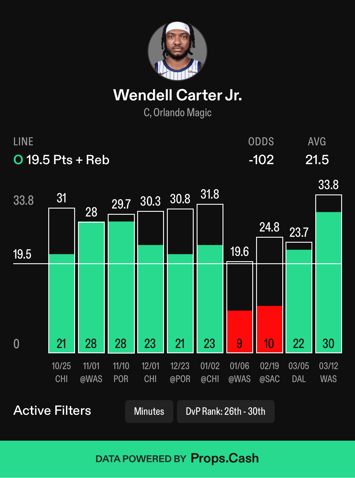 In his 10 games against those teams this season, he’s averaging 21.5 points + rebounds per game, and when playing 20 or more minutes in those games, he’s averaging 22.9 P&R with an 89% hit rate.