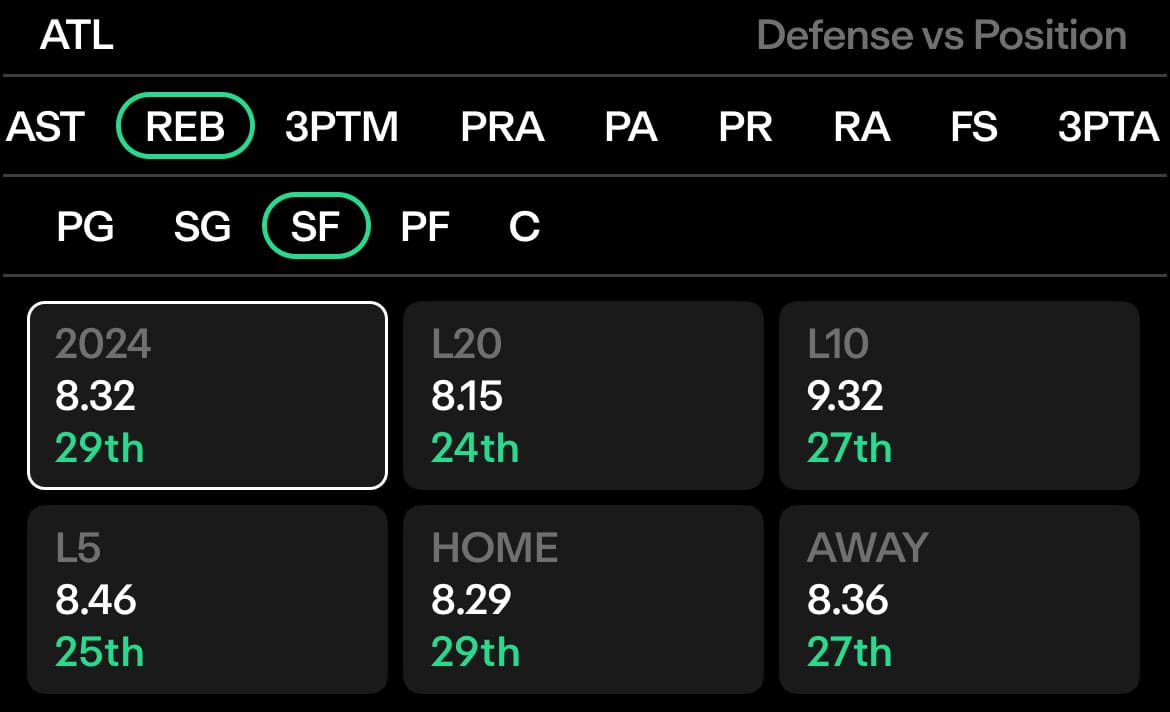 He faces the Atlanta Hawks tonight, and it’s a great matchup. They allow 8.2 rebounds per game to small forwards, the second most in the NBA.