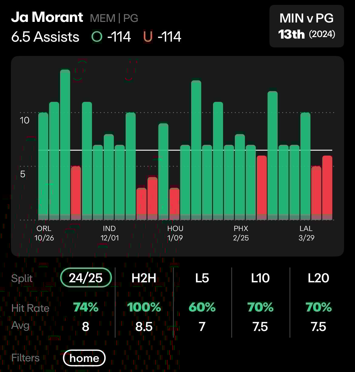 At home, Ja moves the rock. He’s averaging 8 assists per game on home court this season, and has cleared this assist line in 20 of 27 home games thus far. Worth noting: he’s never gone under this line in three straight at home, and he’ll have to go over to keep that streak alive.