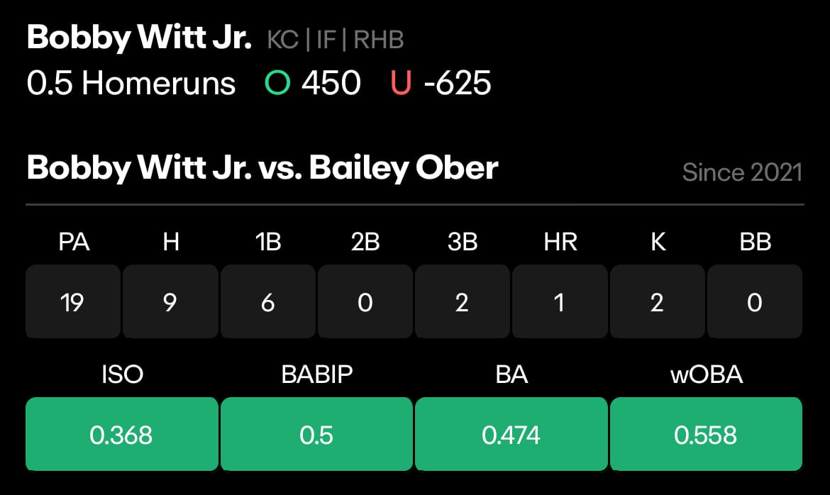 Bobby Witt only has 1 home run in 19 plate appearances against Ober, and a .176 barrel percentage, but it’s Ober’s numbers that caught our eye. He’s already given up three home runs in just 36 plate appearances so far this season in just two starts, after allowing 27 all of last year.