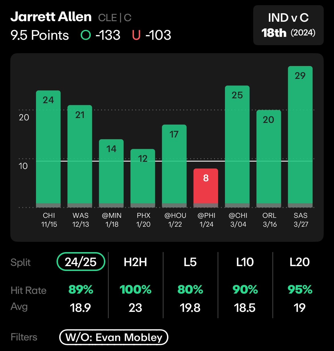 With the playoffs approaching, and the Cavs locked in as the number one seed, Allen may see fewer minutes tonight, but Cleveland is already without several key players. Donovan Mitchell and Darius Garland are maintaining injuries, and Evan Mobley is resting. Without Mitchell in the lineup this season, Allen is averaging 15.3 points, and without Mobley, he averages 18.9.