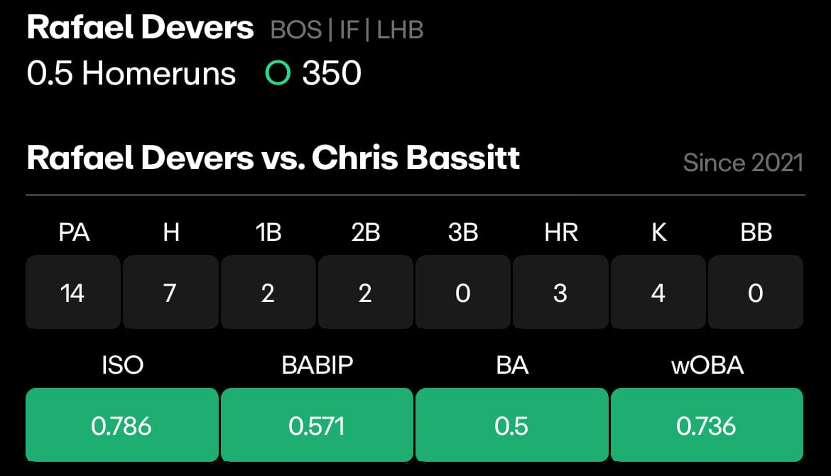 Devers has 14 plate appearances against Bassit and has sent the ball over the wall three times against the righty. Devers also has a .500 barrel percentage against Bassit, and has 7 hits in those 14 appearances.