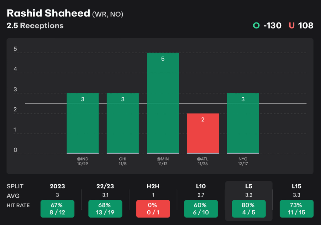Rashid Shaheed has reeled in three or more “Receptions” in four of his last five – During this stretch, Shaheed is logging 3.2 Receptions/G while seeing 4.8 Targets/G. Last week, three different WRs hit their Reception Line vs LAR – Will Shaheed be included in that trend tonight?