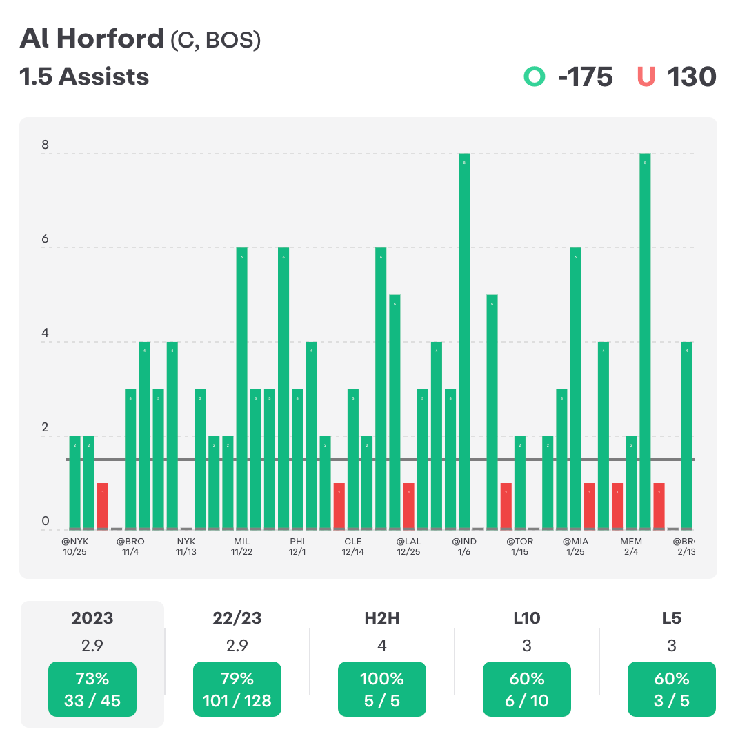 Overall, this line has been easy for Horford. He’s hit in 6 of his last 10 games and clipped this line at a rate of 73% this season.