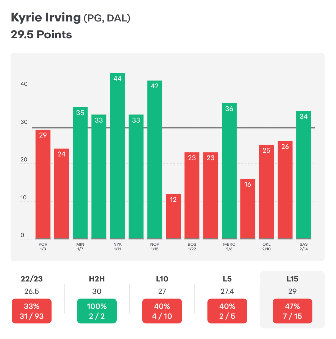 As with all alternative lines that are above the original line, there’s some obvious risk. He’s only scored 30 or more points 27% of the time this season, but if you look at the last 15 games before the break, he managed 30 or more in nearly half.
