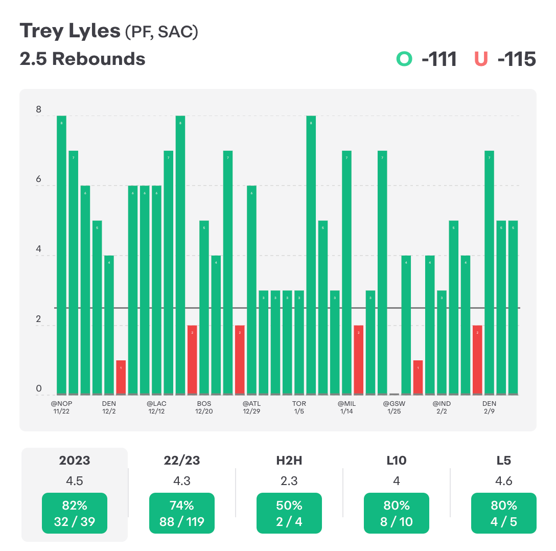 Lyles at just 2.5 rebounds is surprisingly low. He’s averaged 4.5 rebounds per game and gone above this line in 82% of his games this season.