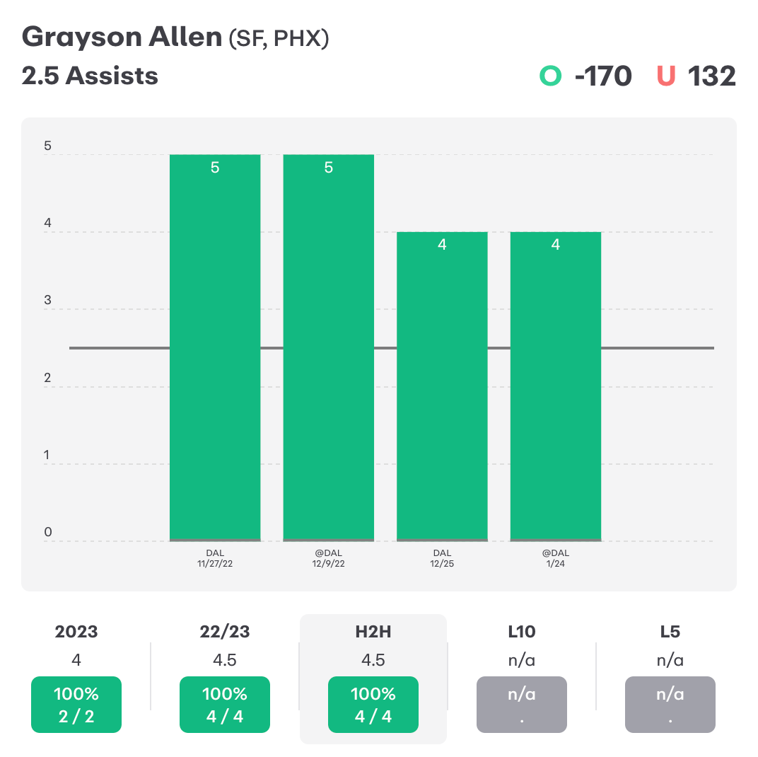 Our projection model has Grayson Allen ending this game with 4 assists, which lines up with both of his performances against the Mavs this season.