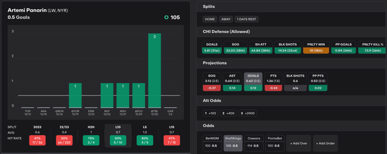 You quickly see a few names appear, namely New York’s Artemi Panarin, who has a goal in four of his last five games and in 75% of recent games against his night’s foe.