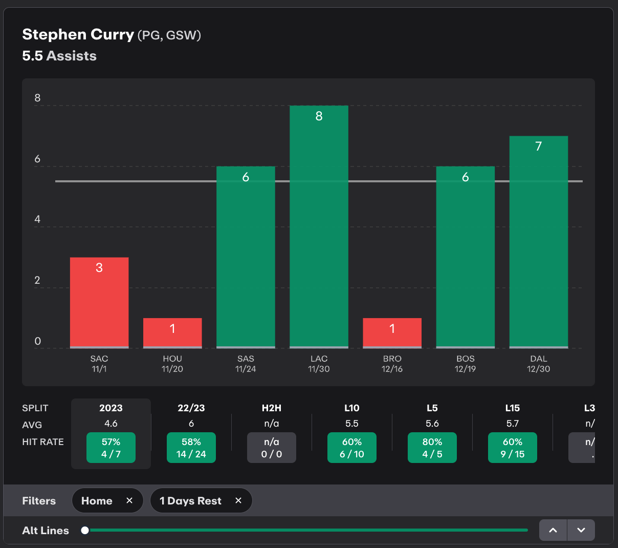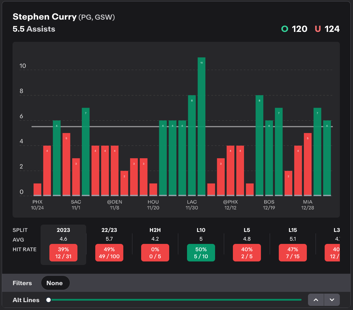 The first trend of interest that came up for us was Steph Curry’s assists. Curry is over this 5.5 line in just 39% of his games this season, and most books actually have him set at 4.5 here, which yields only a slightly better hit-rate of 45%.