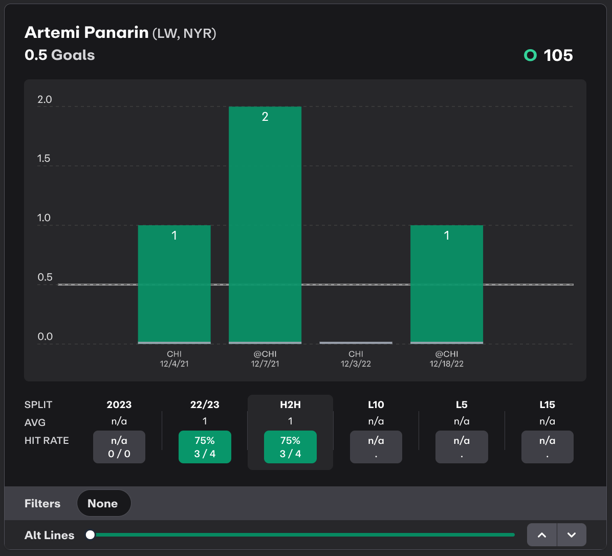 Panarin has sure loved seeing Chicago, scoring four goals across his past four meetings. Perhaps you say “okay, this looks great, but goals can be up-and-down.”