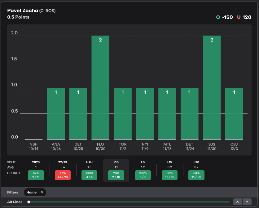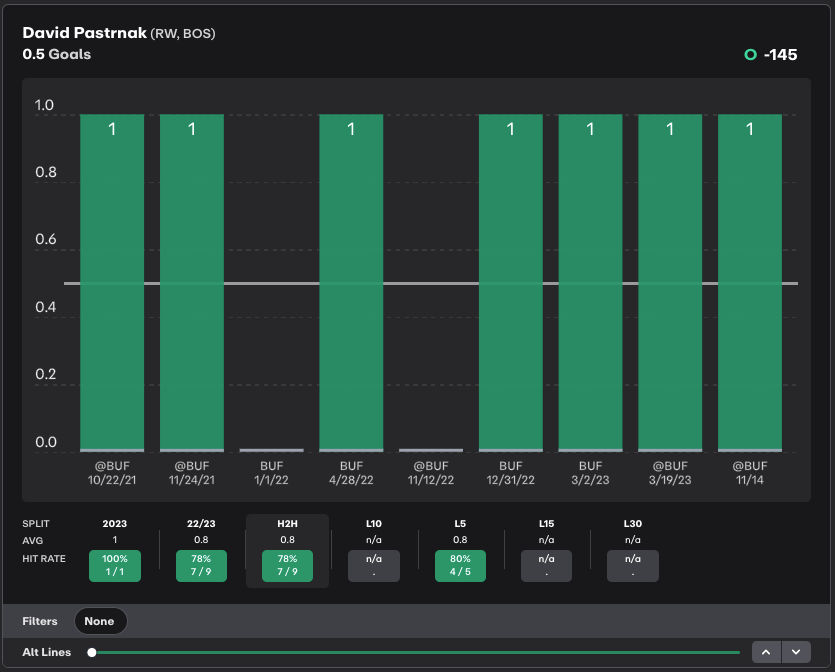 Perhaps you see that David Pastrnak, Boston’s top shooter, has scored in four straight against the Sabres and seven of the past nine meetings. That looks good, but the -145 price on a goal prop is less than ideal.