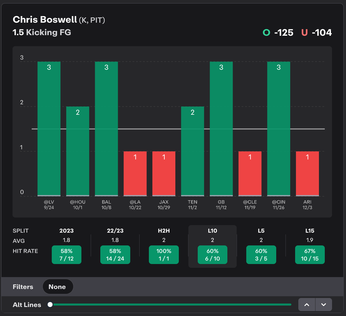 Chris Boswell has cleared his 1.5 field goals line in 7 of 12 games this season. This match up between the Steelers and Patriots is expected to be low scoring. Will the Steelers need to rely on Boswell in this one? He is 9/13 at home over this line since last season.
