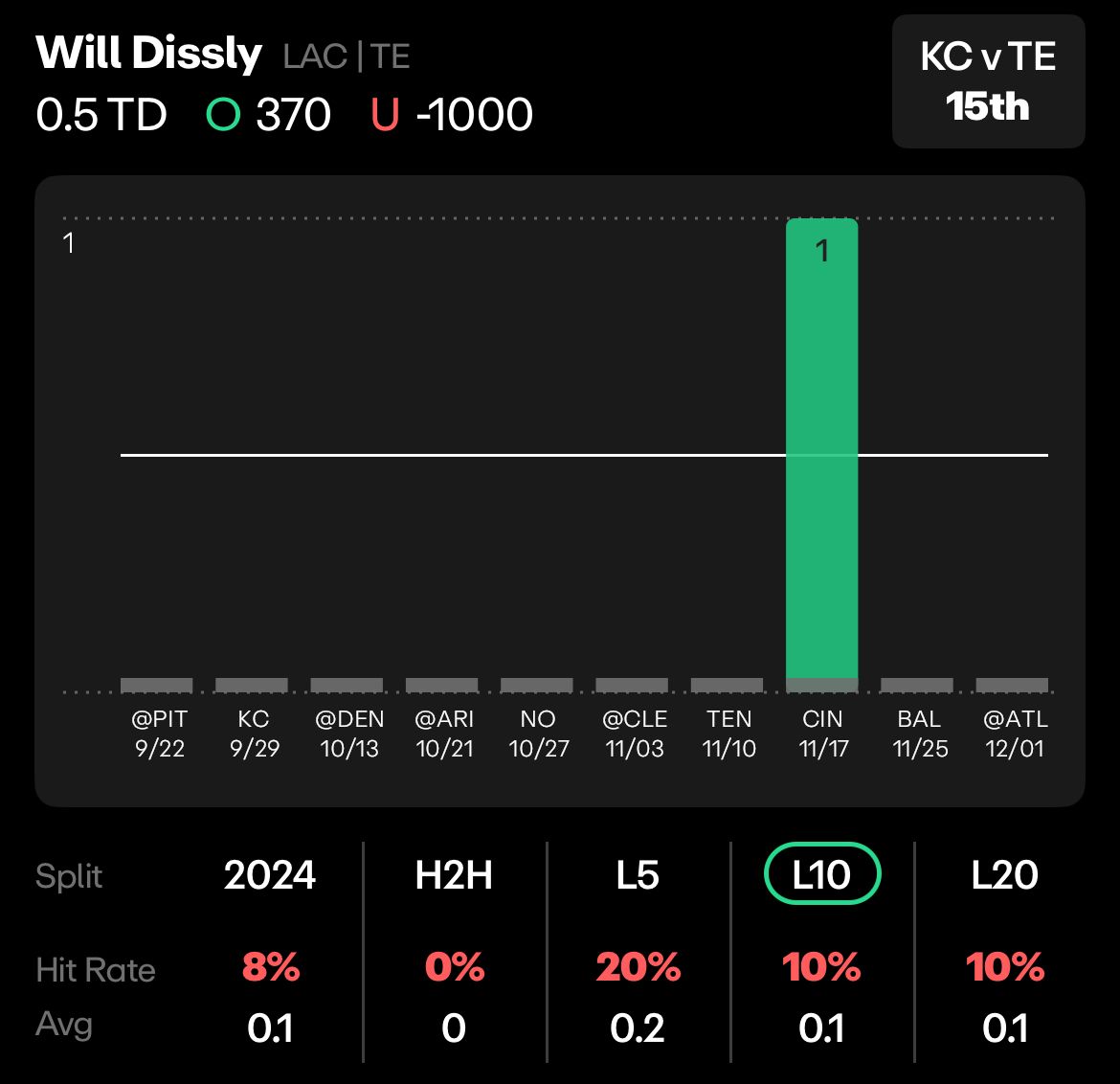 The Kansas City Chiefs allow 0.83 receiving touchdowns per game to tight ends this season, 18th in the NFL. A far cry away from a stat that jumps off the page, but they do allow the most yards to tight ends. Unfortunately for bettors, the Chargers don’t have an elite tight end, with Will Dissly leading the charge in most categories, and he only has 1 touchdown this year.