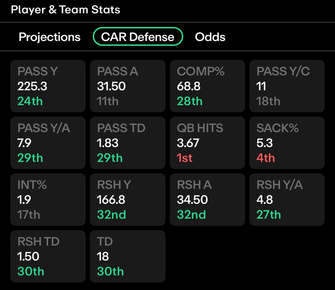 Saquon scoring one feels as close to a lock this season as you can get, but what about for two? He has 5 mulit-touchdown games this season and has as many multi-touchdown games and no-touchdown games. The Panthers have allowed three running backs - Chase Brown, Bijan Robinson, and Roschon Johnson - to score 2 touchdowns against them this season.
