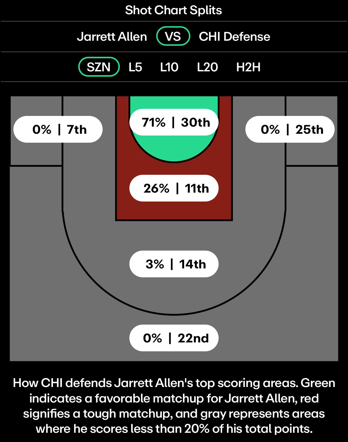 Even with his poor play, Allen is in a position to break out of the slump tonight. First off, his matchup is great. The Chicago Bulls allow 25.35 points per game to centers, second most in the NBA, and 18.35 shot attempts per game, also second most in the NBA. Allen scores a whopping 71% of his points from the restricted zone, where the Bulls allow the most points in the NBA.