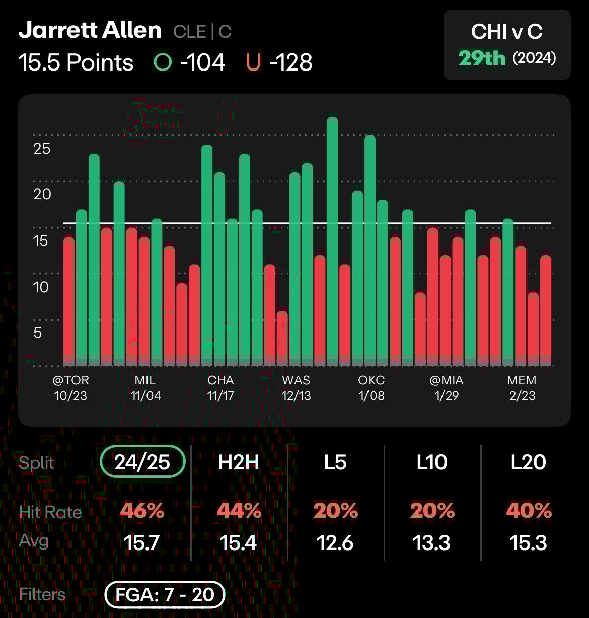 Simply put, Allen is shooting less. He’s attempting 1.4 fewer shots per game in his last 5 games than his season average. That may sound like a small change, but when Allen attempts 6 or fewer shots, he averages just 9.1 points per game and has gone over his 15.5-point line in just 5% of games. When he attempts 7 or more, he averages 15.7 points and has gone over this line 46% of the time.