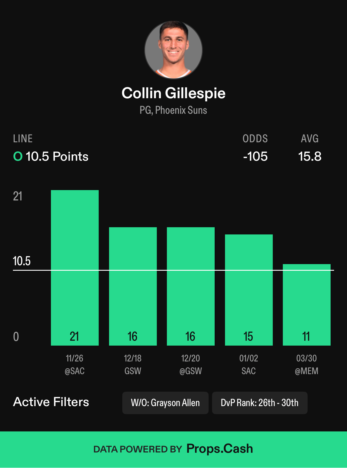 The cherry on top for Gillespie: in games against teams that rank in the bottom 5 of points allowed to opposing PGs, without Grayson Allen playing, Gillespie is averaging 15.8 points with a 71% hit rate.