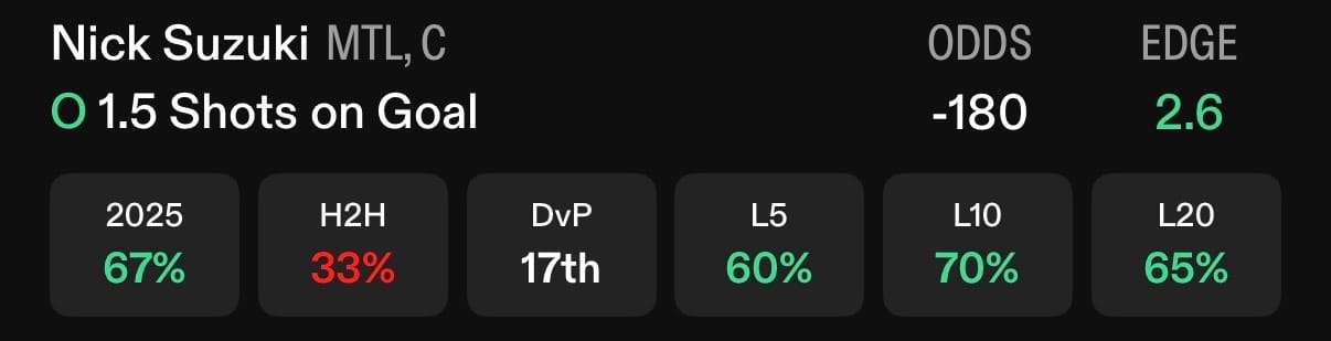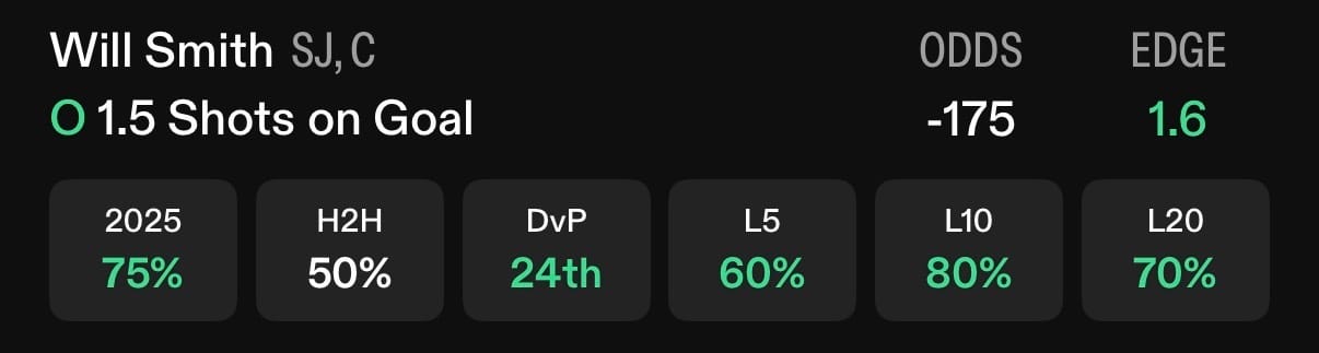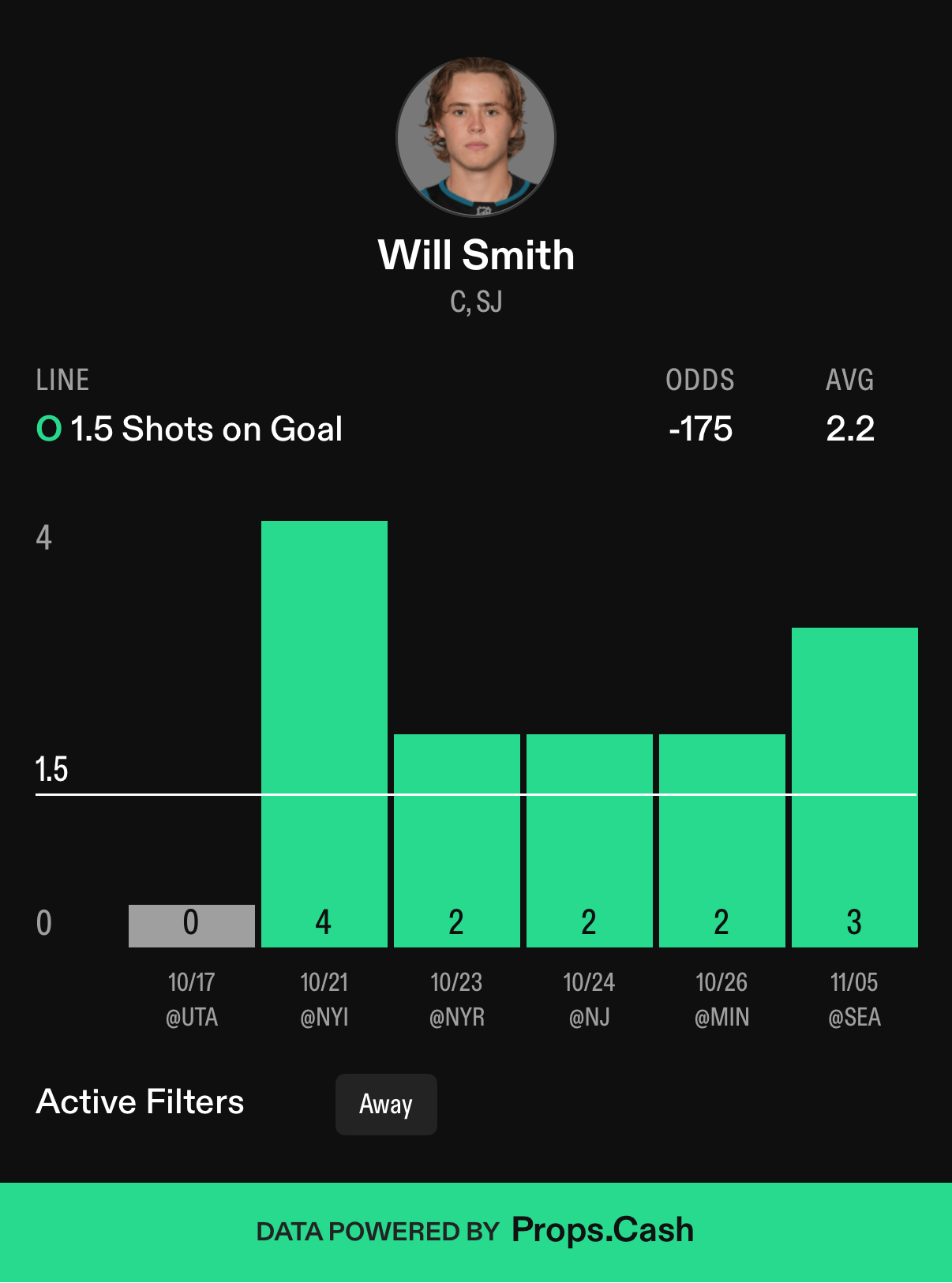 Overall, this season, Smith has cleared this line in 75% of his games, with a 2.1 shots on goal average. On the road, it’s even better, with a 2.2 shots on goal average and a whopping 83% hit rate.