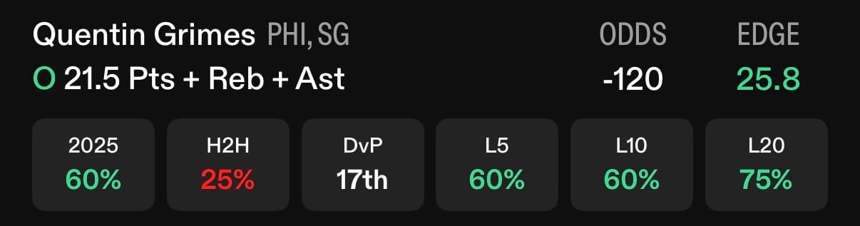 The 76ers are favoured by -1.5, and in wins this season, Grimes is averaging 27.3 PRA with a 67% hit rate.