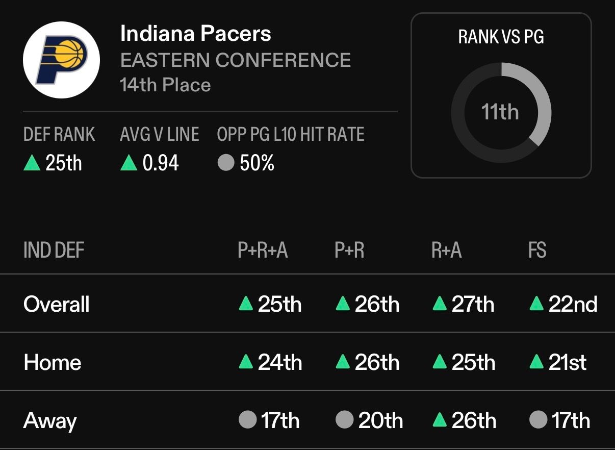 He’s only played two games this season, averaging 14 PRA, clearing this line in 1 of the 2 games. But his matchup against the Pacers is a decent one - they rank 25th in defense overall, 11th in PRA defense against point guards, and 50% of point guards have cleared their line vs Indiana in their last 10 games.