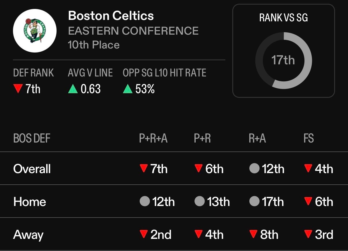 He’s averaging 25.7 PRA this season, clearing this line in 60% of his starts. At home, his average drops to 22.6 PRA, but his hit rate holds steady at 60%. His matchup is interesting - the Celtics rank 17th in PRA defense against shooting guards, with 53% of shooting guards clearing their line against Boston in their last 10 games, by an average of 0.63 PRA.