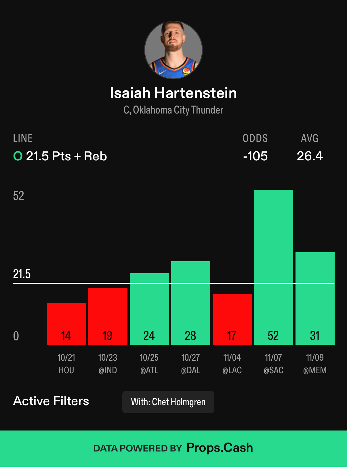 Hartenstein is averaging 25.2 PRA this season, clearing this line in 55% of his starts. At home, that average dips to 21.3 PRA with a 50% hit rate. Chet Holmgren is playing, which would usually make us wary of this trend, but Hartenstein is averaging 26.4 PRA with Chet, thanks to 52 & 31 PRA in his last 2 starts with his fellow big man.