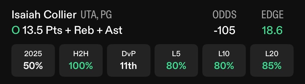 Collier gets the best Edge across the 6 games in the NBA, with an Edge difference of 5.1 PRA.
