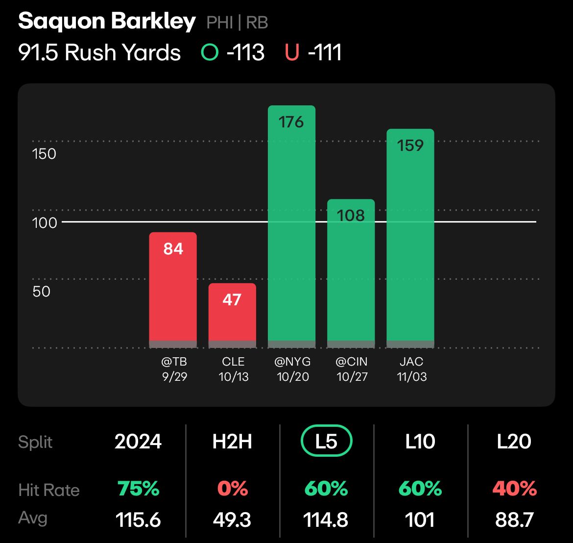 David vs Goliath Part 2! On paper, that is. Barkley is on another level right now, averaging 115.6 rushing yards per game over his last 5 games, and 147.66 yards per game over his last 3. Video game numbers.