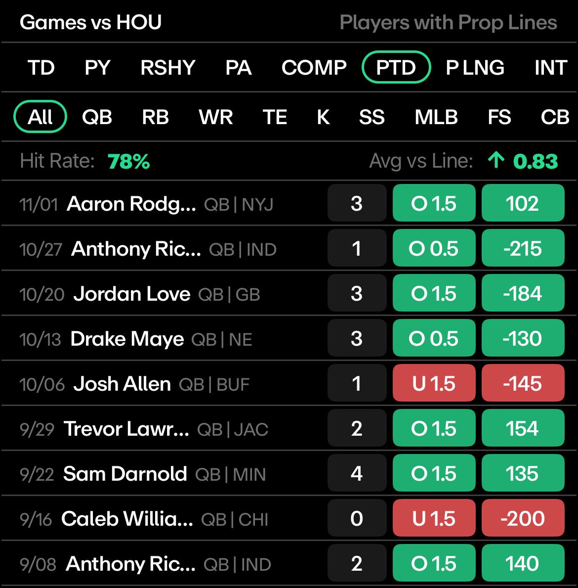 Houston allows 2.11 passing touchdowns per game, the second worst in the NFL. Opposing quarterbacks are cooking these guys right now, with 3 of the last 4 QBs to face the Lions have had 3 passing touchdowns, and the only one who didn’t was Anthony Richardson, who has since been benched.