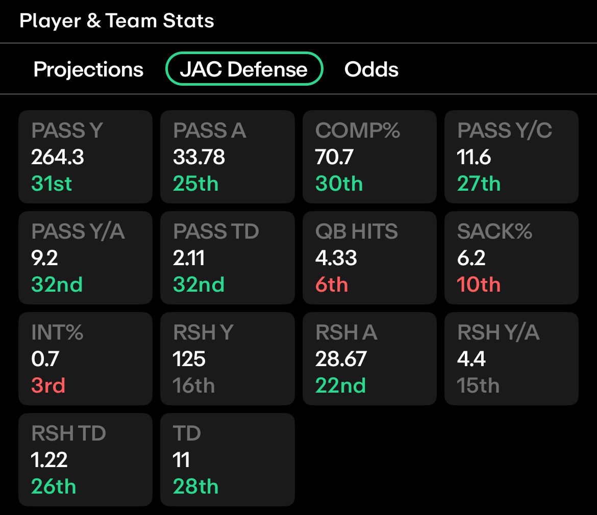 The Jaguars average 264.3 passing yards against per game, 31st in the NFL. On paper, this is a David vs Goliath game.