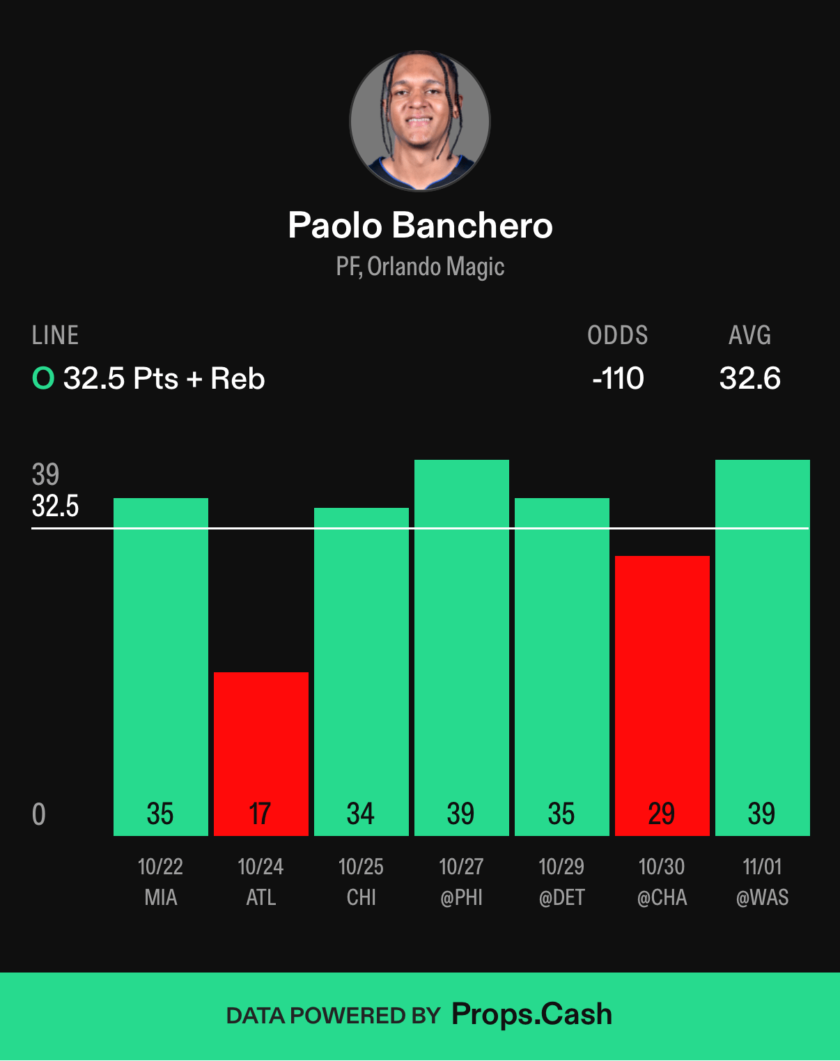 Banchero is averaging 32.6 PRA this season, clearing this line in 71% of his games. Similar to Leonard, Banchero has one bad game that stands out. In the second game of his season, he had just 17 PRA, and if we eliminate that outlier, his average jumps to 35.16 PRA.