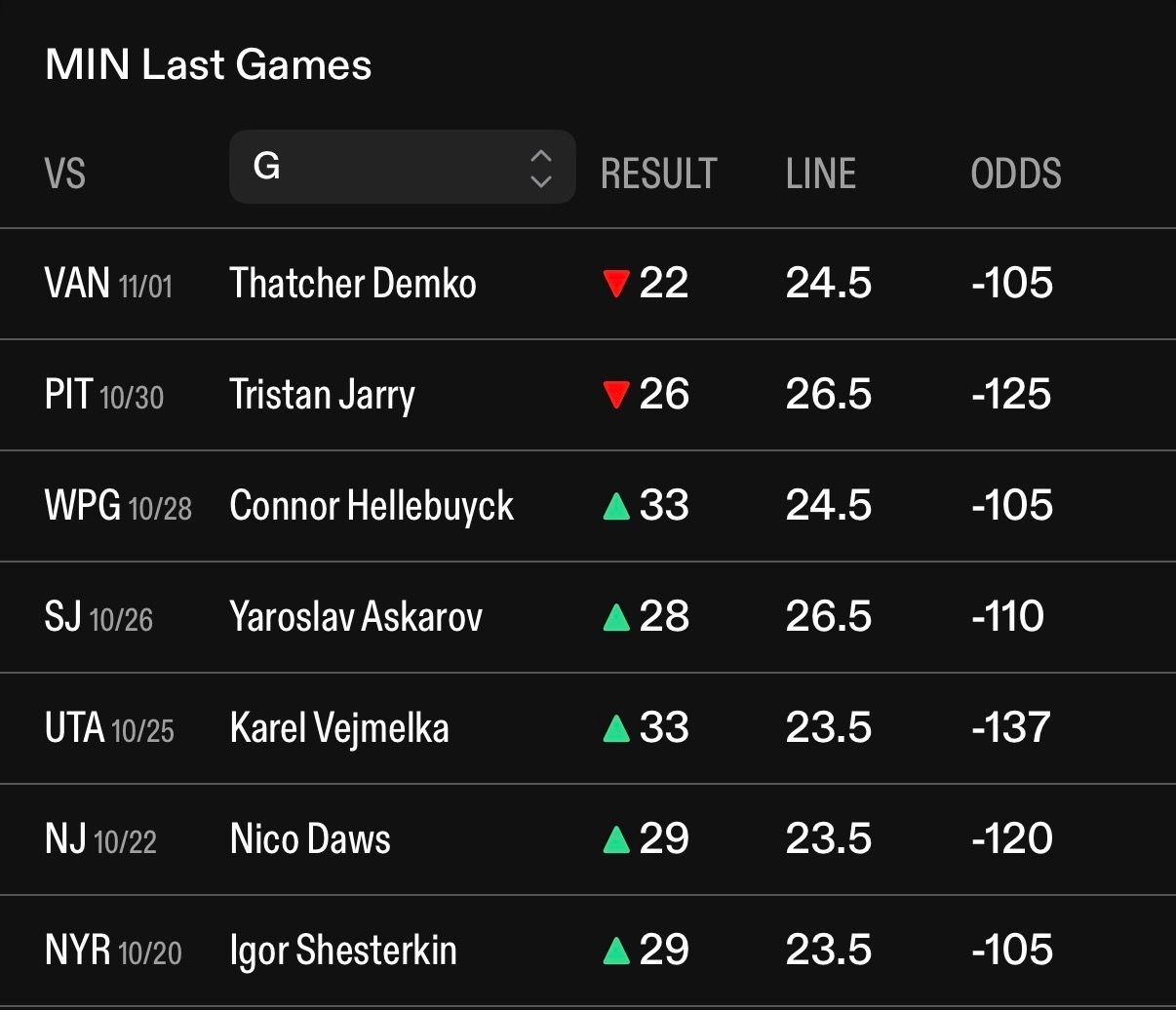 More importantly, 6 of the last 7 goalies to face Minnesota have cleared this number, with Thatcher Demko being the outlier at 22 saves.