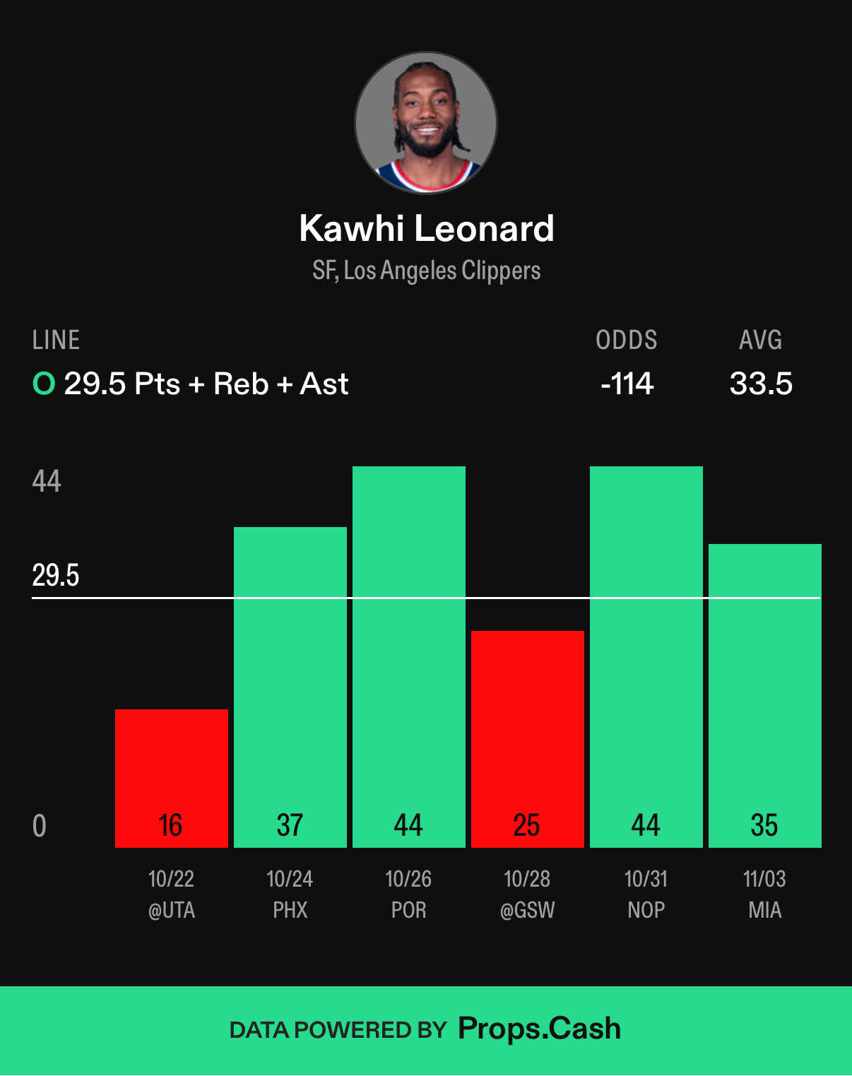 Leonard has cleared this line in 67% of his games this season, averaging 33.5 PRA. If you eliminate the first game of the season, where he only had 16 PRA, his average jumps to 37 PRA. He’s also 4-0 at home, averaging 40.0 PRA.
