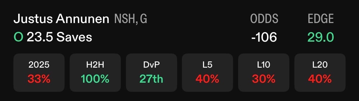 This is just Annunen’s third start of the season. In both games, he had enough shots against to clear this line, but in his October 14th start, the Maple Leafs were able to put a 5-spot up against him, leading to just 21 saves. He held Dallas to 3 goals and registered 25 saves on October 26th.