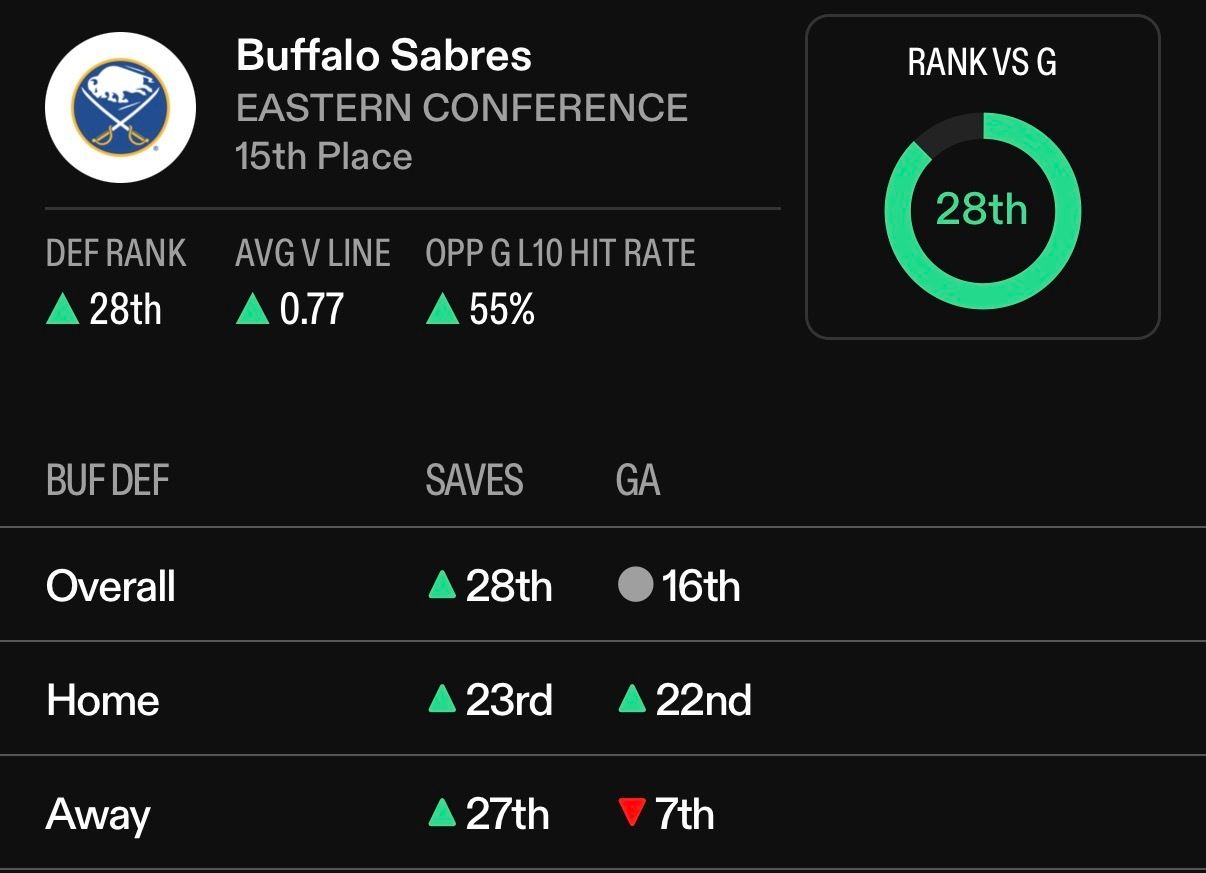 Vejmelka is averaging 22.6 saves per game this season, clearing this line in 33% of his games. Admittedly, the first look at the data for Vejmelka isn’t great. But opposing goalies’ data against Buffalo, Vejmelka’s opponent tonight, is what jumps off the page.