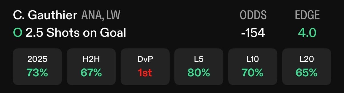 Gauthier is averaging 4.7 shots on goal this season, clearing this line in 73% of his games so far, and in 50% of his home games, averaging 3.8 shots on goal in Anaheim.