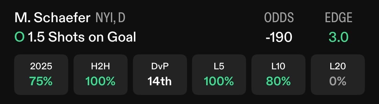 Schaefer’s shots on goal data this season is exceptional - he’s averaging 3.0 shots on goal, clearing this line in 75% of his games this season, and in 5 straight coming into this one.