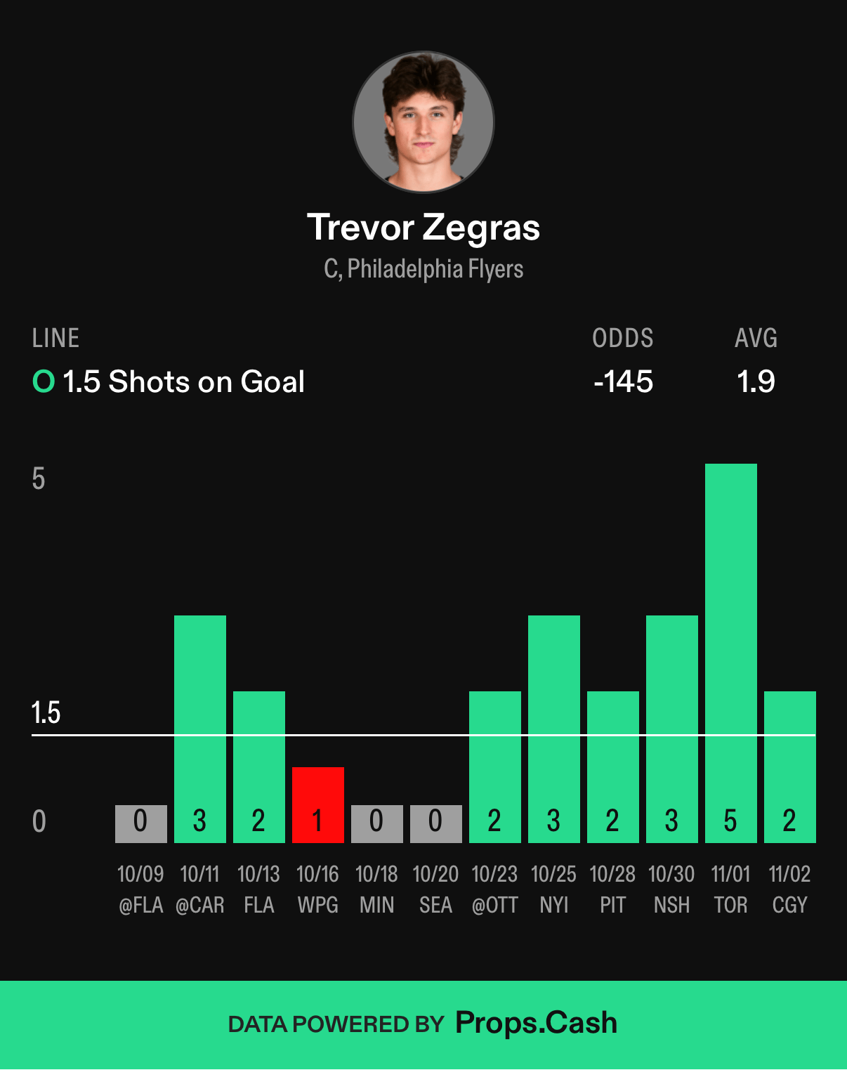 Zegras is averaging 1.9 shots on goal this season, clearing this line in 67% of his games. In his first 6 games, he had 6 shots on goal total. In the 6 games that followed, Zegras had 2 or more shots on goal each time, averaging 2.8 shots on goal.