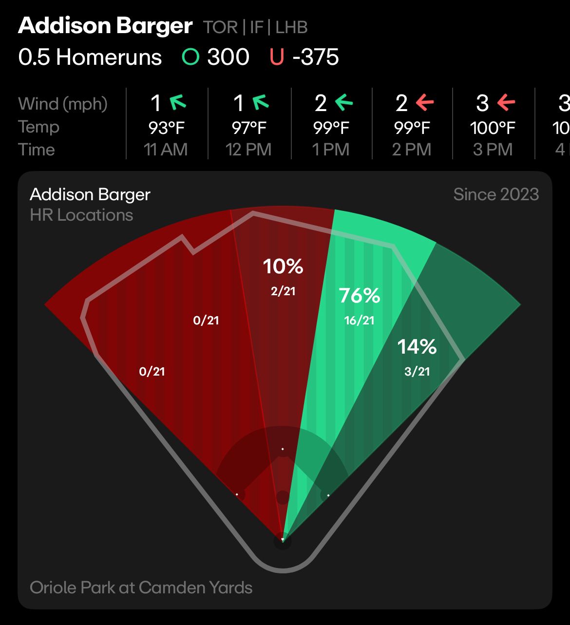 And then there’s the weather in Baltimore. It’s hot, and we mean really hot. It’s over 100 degrees at Camden Yards, with virtually no wind. If Barger connects, the ball will fly in that heat. Let’s hope he connects.