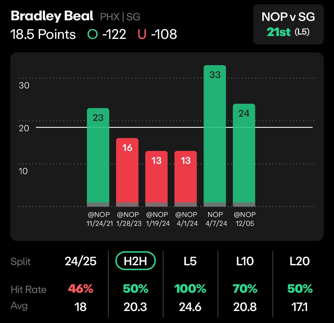 Beal gets the Pelicans tonight, who hold shooting guards to the 3rd worst 3-point percentage in the NBA (27.48%), the 4th worst field-goal percentage (38.3%), and rank 14th in shooting guard defense by points per game (21.91). But in their last 5 games, that has ticked up to 23.84 points (21st).