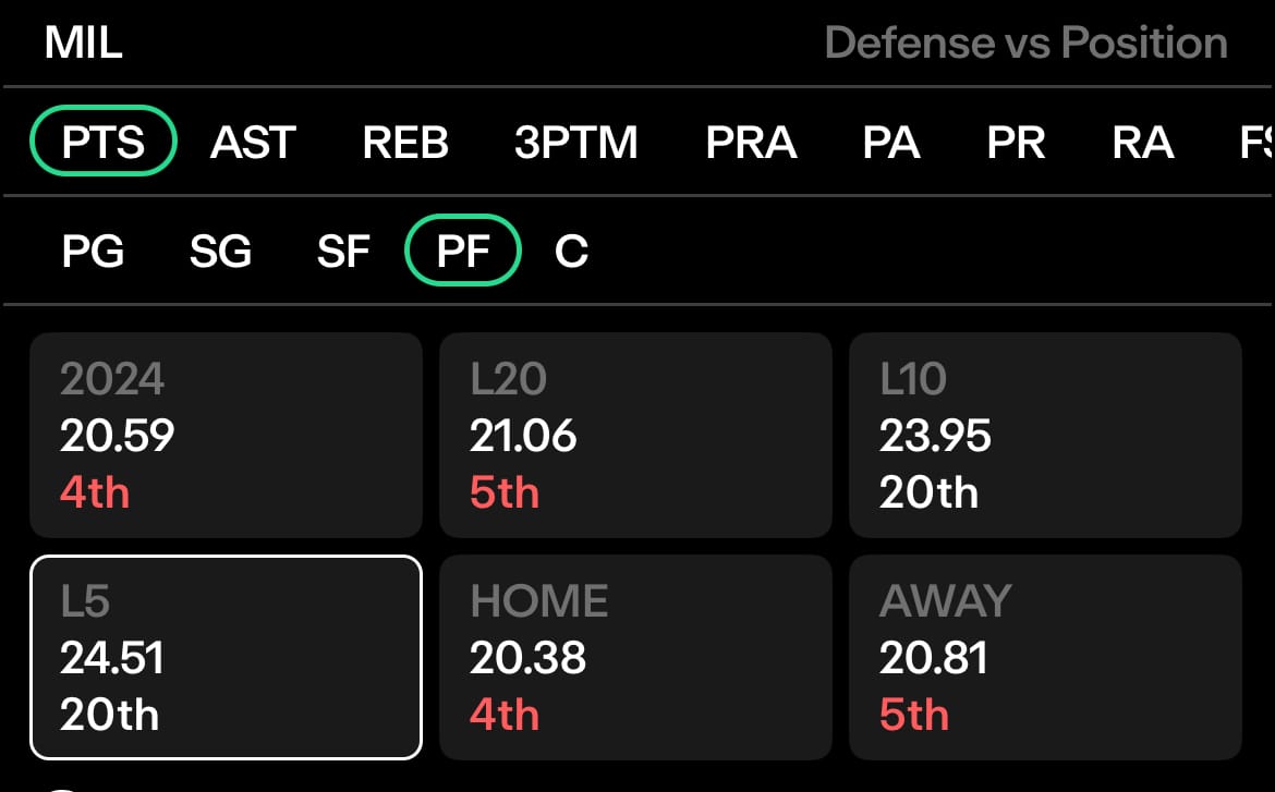 And over their last 5 games, the Bucks are allowing 24.51 points per game to power forwards, good for 20th in the NBA. A pretty big falloff from their average of 20.59 points per game, which ranks 4th in the NBA.