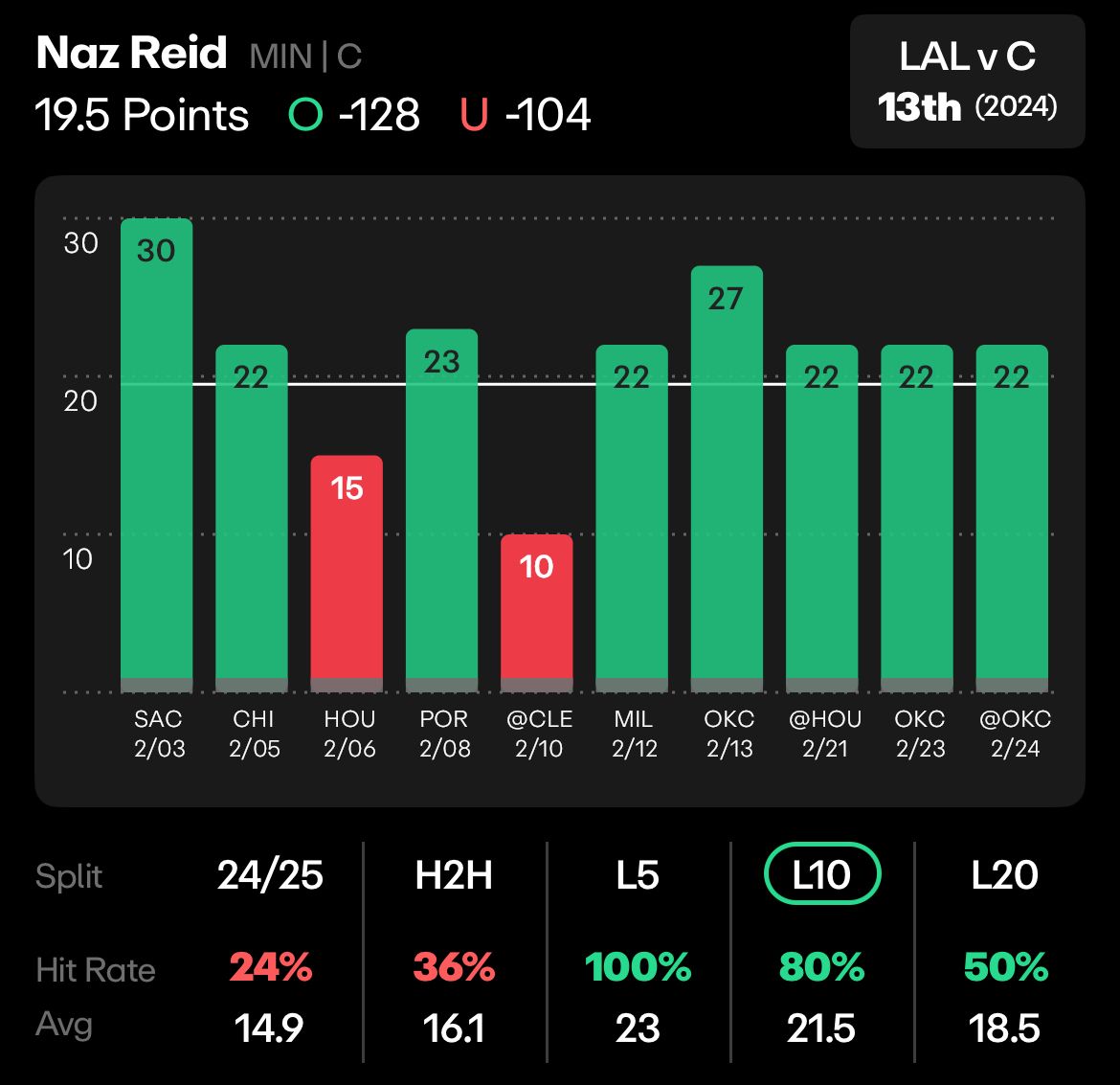 Naz Reid’s average over his last 10 games is 21.5, and his average over his last 5 is an even better 23.0. If you put those numbers up against his season average of 14.9, you can make the argument that he’s been the best bet in the NBA over this recent stretch of games.