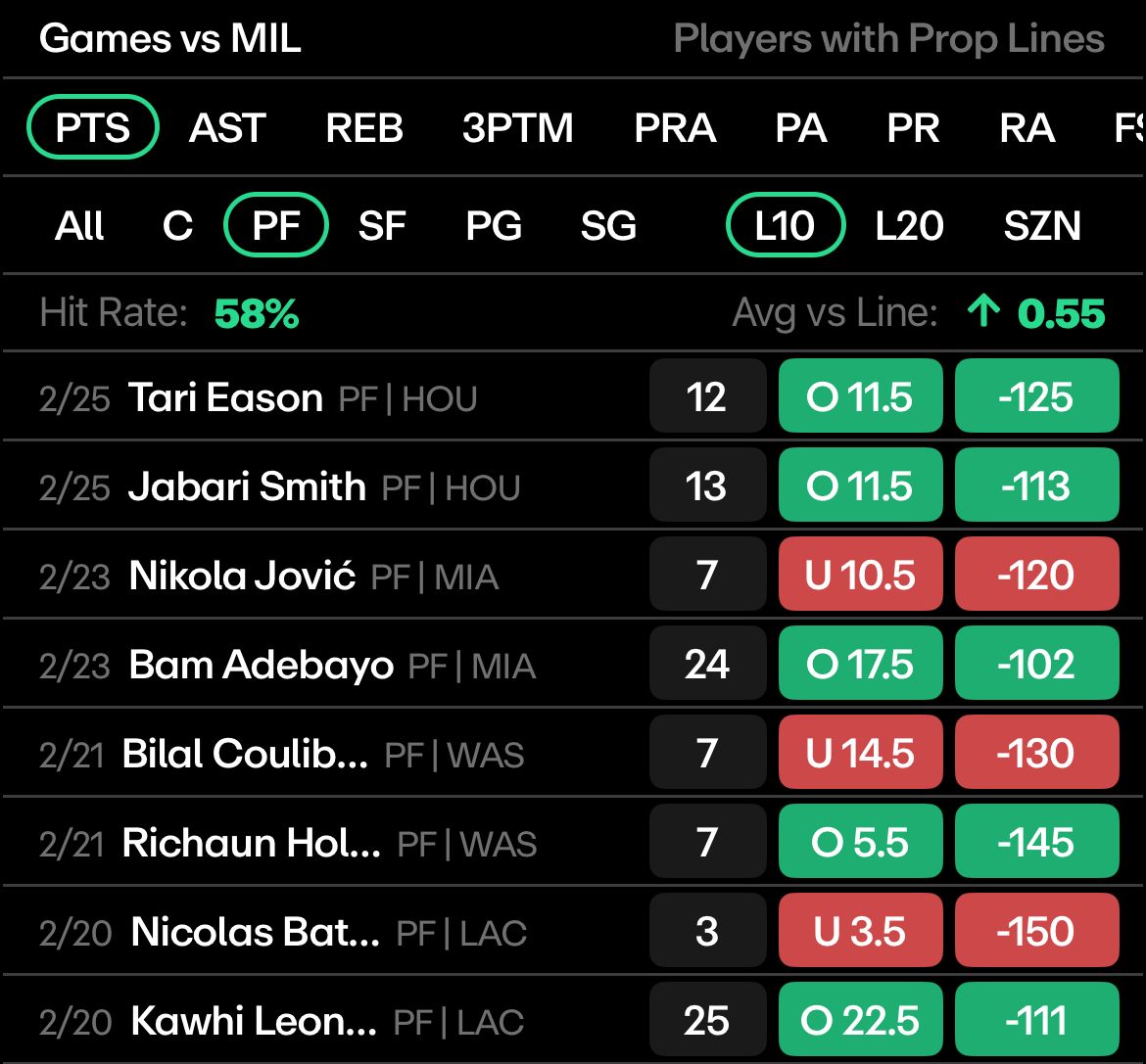 As for how power forwards have performed recently against their betting lines versus Milwaukee - that also plays into their advantage. 58% of power forwards have gone over their point line against Milwaukee in their last 10 games.