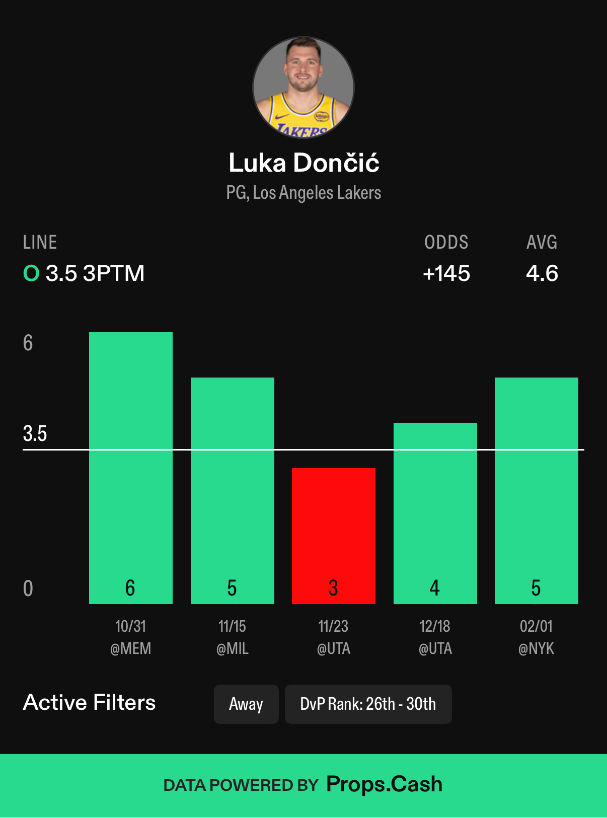 And then there’s his play recently - over his last 10 games, he’s averaging 5.0 made threes with an 80% hit rate, and over his last 5 games, he’s averaging 5.6 made threes with a 100% hit rate.