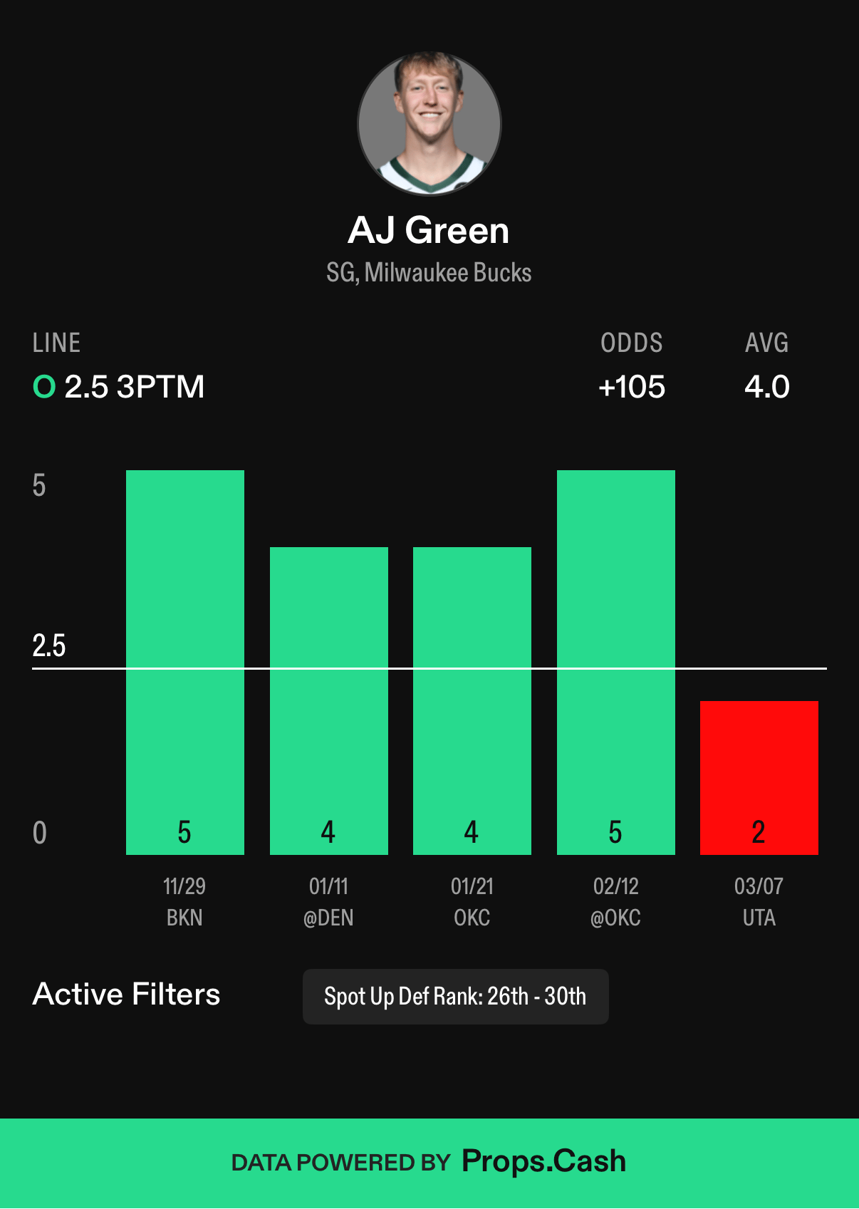 Green has 5 games this season against teams that rank in the bottom 5 of Spot-Up shooting. In those 5 games, he’s averaging 4.0 made threes with an 80% hit rate.