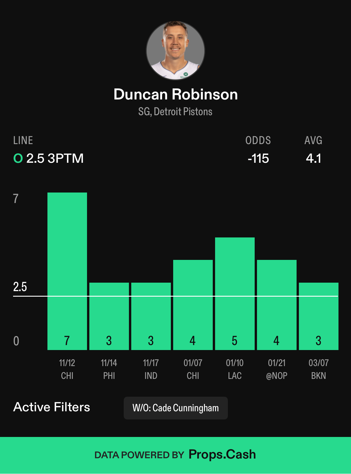 As you can see, Robinson is averaging 4.1 made threes with a 100% hit rate across 7 games without Cade this season. This season, across all games, Robinson is averaging 7 attempts from three per game. But in those games without Cade, he averaged 7.9 attempts from three, and only had 1 game with 5 or fewer attempts from three.