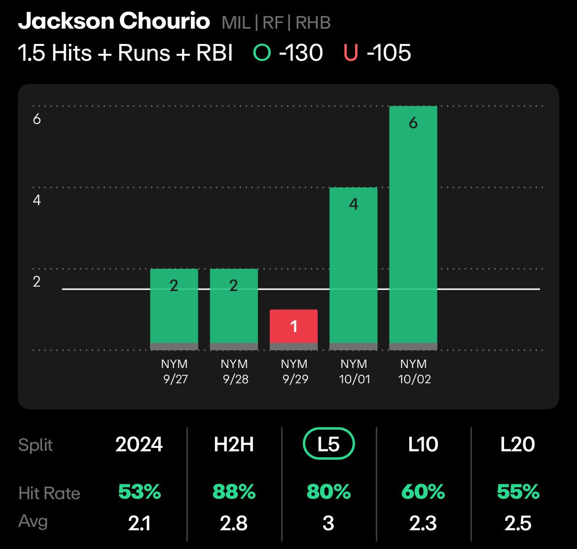 Jackson Chourio Over 1.5 Hits+Runs+RBIs